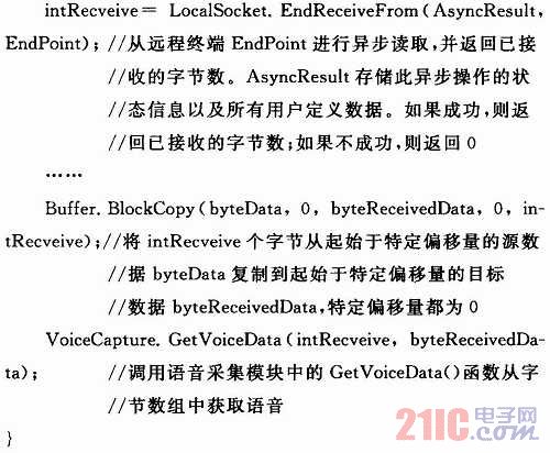 數(shù)據(jù)接收函數(shù)的功能主要是調(diào)用GetVoiceData()函數(shù)從網(wǎng)絡(luò)中接收語(yǔ)音數(shù)據(jù)并放入緩沖區(qū)。代碼如下: