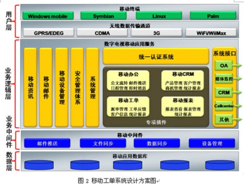 移動工單系統(tǒng)是在Windows Mobile智能手機操作系統(tǒng)上自主研發(fā),采用B/S和C/S混合架構,以TCP/IP作為基礎數(shù)據(jù)傳輸協(xié)議,通過移動通信網(wǎng)絡無線數(shù)據(jù)通道GPRS/EDGE/CDMA1x等,將呼叫中心的工單數(shù)據(jù)推送到智能手機上,由外勤服務人員將服務情況進行實時的反饋。利用的同步中間件可將最新的資訊文件推送到手機終端上,服務人員無需登錄即可在終端可以查看最新的廣電資訊,可支持doc、xls、ppt等 Office文檔格式的瀏覽,支持WMV、WAV、3GP多種音視頻文件播放。服務人員可以不受地點和時間的限制通過終端實時獲取最新的多媒體客戶交互中心運營數(shù)據(jù)報表,圖2為系統(tǒng)設計方案圖。