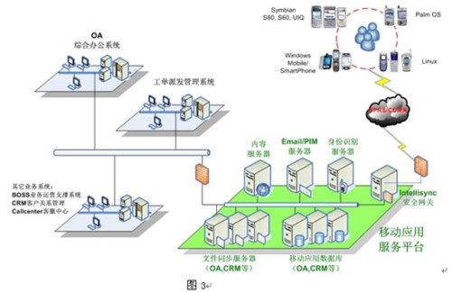用戶通過智能手持終端訪問應用,平臺支持采用Symbian、SmartPhone、PocketPC和Palm操作系統(tǒng)的終端,還支持SyncML、brew、java、Windows PC的應用。