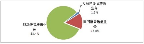 按網(wǎng)絡(luò)接入方式分類(lèi),語(yǔ)音增值業(yè)務(wù)可以分為固網(wǎng)語(yǔ)音增值業(yè)務(wù)、移動(dòng)語(yǔ)音增值業(yè)務(wù)和互聯(lián)網(wǎng)語(yǔ)音增值業(yè)務(wù)三種。市場(chǎng)占有比例分別是:固網(wǎng)語(yǔ)音增值業(yè)務(wù)占15%,移動(dòng)語(yǔ)音增值業(yè)務(wù)占83.4%,互聯(lián)網(wǎng)語(yǔ)音增值業(yè)務(wù)占1.6%。如下圖所示: