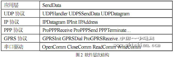 程序中的所有代碼都是由C 語言編寫的,并采用分層的結(jié)構(gòu),從底到上分別為:串口驅(qū)動(dòng)層、GPRS 模塊驅(qū)動(dòng)層、PPP 協(xié)議層、IP 協(xié)議層、UDP 協(xié)議層與應(yīng)用層。上層函數(shù)的實(shí)現(xiàn)需要應(yīng)用到底層函數(shù),而底層函數(shù)的任務(wù)就是為上層函數(shù)提供服務(wù),最終完成應(yīng)用層任務(wù)——傳送數(shù)據(jù)。各層的主要函數(shù)如圖2 所示: