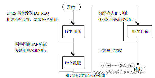 系統(tǒng)的一個(gè)難點(diǎn)是微控制器登陸 GPRS 網(wǎng)關(guān)(GGSN)并與網(wǎng)關(guān)通過LCP、PAP、IPCP 協(xié)議進(jìn)行協(xié)商的過程。LCP、PAP 與IPCP 協(xié)議的幀結(jié)構(gòu)大同小異,最常用的為請求(REQ)、同意(ACK)和拒絕(NAK)三種幀。微控制器與GGSN 各為一方進(jìn)行協(xié)商,任何一方都可以發(fā)送REQ 幀請求某方面的配制,另一方覺得配置不能接受會(huì)回應(yīng)NAK 幀,如果可以則回應(yīng)ACK 幀。為了節(jié)省資源,我們只處理這三種數(shù)據(jù)幀,其它鏈路問題都由微控制器在程序控制下自己重新?lián)芴?hào)解決。協(xié)商過程大致描述如下:在撥號(hào)成功連接后,GGSN 首先會(huì)返回一個(gè)PAP REQ 數(shù)據(jù)幀。我們發(fā)送一個(gè)空 LCP REQ 幀,以強(qiáng)迫進(jìn)行協(xié)議協(xié)商階段。隨后,GGSN 發(fā)送LCP 設(shè)置幀,我們拒絕所有的設(shè)置并請求驗(yàn)證模式。GGSN 選擇CHAP 或PAP 方式驗(yàn)證,我們只接受PAP 方式。然后,進(jìn)行PAP 驗(yàn)證用戶名和密碼過程,在GPRS 中用戶名與密碼都為空,如果成功,GGSN 會(huì)返回IPCP報(bào)文分配動(dòng)態(tài)IP 地址。此時(shí),就完成了與GGSN 的協(xié)商過程。協(xié)商過程的狀態(tài)轉(zhuǎn)換如圖5 所示。