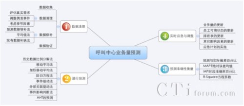 業(yè)務量預測的大體流程可分為數(shù)據(jù)清理、實施預測、預測準確性衡量、實時應急與調整等幾個步驟。每一步的詳細內容請見下圖: