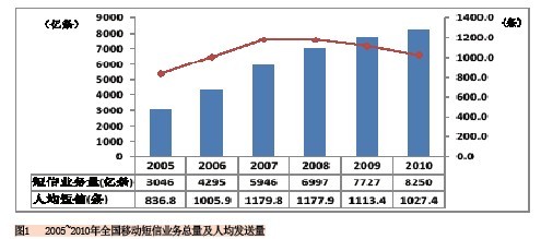 從圖1可以看到,全國移動短信業(yè)務(wù)總量的增速逐年降低,而年人均移動短信發(fā)送量則從最高的2007年的1180條下滑到了2010年的1027.4條。