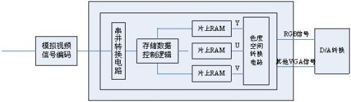 由于YUV信號在模擬信號中是交織著的,所以需要一個信號選擇電路。YUV一共是三路信號,設(shè)計(jì)一個計(jì)數(shù)器進(jìn)行選擇,計(jì)數(shù)是O和2時,是UV信號,計(jì)數(shù)是1和3時是Y信號,完成的實(shí)際上是串行信號轉(zhuǎn)并行信號的過程。以上過程可以用圖3的原理框圖來表示。