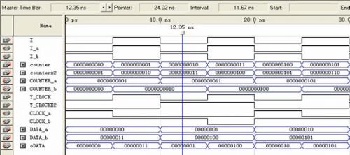 使用的信號包括:數(shù)據(jù)信號data_a,dat_b;讀寫有效信號wren_a,wren_b;地址信號address_a,address_b;時鐘信號clock_a,clock_b;輸出數(shù)據(jù)信號q_a,q_b?梢钥吹剿械男盘柖际浅蓪Τ霈F(xiàn)的,就是為了進(jìn)行乒乓方式的數(shù)據(jù)傳輸。分成了兩個RAM區(qū)域,A和B,相當(dāng)于前面講乒乓方式里的數(shù)據(jù)緩沖模塊1和2。兩個RAM塊是交替著讀寫(由I_a和I_b決定),輸出數(shù)據(jù)流也是由I決定。剛說到寫時鐘是13.5M,讀時鐘是27M,所以clock_a和clock_b必須是讀寫時鐘切換著輸入,而且地址的計(jì)數(shù)也不一樣,寫周期時候地址增加的時鐘是13.5M,讀周期地址增加的時鐘是27M。所以每行的數(shù)據(jù)讀了兩遍,相當(dāng)于隔行變逐行。圖6在Qartus II下RAM的乒乓操作功能仿真圖:
