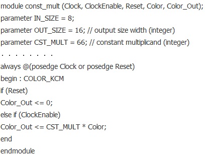 用Verilog HDL編寫代碼,實(shí)現(xiàn)YUV到RGB的轉(zhuǎn)化。其中共包括3個模塊跟1個仿真激勵。在模塊const_mult中,主要實(shí)現(xiàn)乘法運(yùn)算,主要代碼如下: