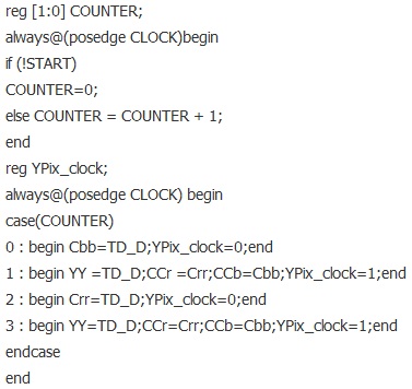 以上代碼完成了圖3的功能,輸入的信號名為TD_D,輸出的三路信號是Cbb,YY,Crr。注意到還有個YPix_clock,實(shí)際上是27M的2分頻,這個時鐘非常有用,在下面將詳細(xì)闡述。