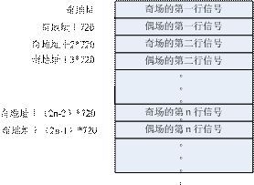 第1種:將一幀的數(shù)據(jù)存儲下來,根據(jù)奇偶場的不同(區(qū)分可以根據(jù)XY),在寫周期的時候,因?yàn)槠鎴龅男兄g有偶場的信號,所以寫數(shù)據(jù)的時候需要跳地址寫,根據(jù)行同步信號(或者SAV也可以)來區(qū)分行,換行的時候地址要加額外的720(用來存放夾雜在奇場信號中的偶場信號),直到出現(xiàn)偶場信號(也就是XY=1)地址切換為初始基地址加720,其余的同奇行的處理方法,具體的地址分配表參照圖4。