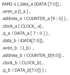 方法2 可以這樣實(shí)現(xiàn):在FPGA內(nèi)部使用Megacore,構(gòu)造一個雙口的RAM,雙口RAM的輸入輸出信號的硬件描述語言定義如下: