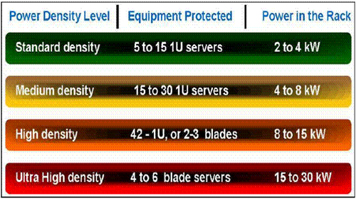 當(dāng)企業(yè)部署刀片式服務(wù)器來(lái)宿主其虛擬服務(wù)器時(shí)尤其如此。刀片式服務(wù)器采用多個(gè)即插即用型處理裝置,它們共享公共的電氣系統(tǒng)、電源、風(fēng)扇、電纜和存儲(chǔ)器。這樣的安排節(jié)省了數(shù)據(jù)中心的占地面積,簡(jiǎn)化了硬件管理,并提高了IT靈活性。然而,這同時(shí)也大大增加了運(yùn)算密度。結(jié)果,刀片式服務(wù)器產(chǎn)生大量的熱,從根本提高了機(jī)柜級(jí)供電要求。確實(shí),一個(gè)典型的傳統(tǒng)服務(wù)器機(jī)柜可能需要4至6 kW電力,而一個(gè)典型的布滿刀片式機(jī)架的機(jī)柜則可能需要高達(dá)30 kW的電力,遠(yuǎn)遠(yuǎn)超過(guò)許多電源和冷卻系統(tǒng)的處理能力。
