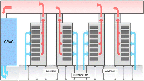 追求更低前期成本和更高運(yùn)行效率的公司可以安裝被動(dòng)式冷卻系統(tǒng)。它們的機(jī)殼上裝有一個(gè)氣密的后門(mén)和煙囪,用于收集來(lái)自服務(wù)氣的熱排風(fēng),并將其直接引導(dǎo)至CRAC裝置上的回風(fēng)管道中。然后,CRAC裝置對(duì)排風(fēng)進(jìn)行冷卻并重新循環(huán)。被動(dòng)式系統(tǒng)要求機(jī)柜從前到后都具有較強(qiáng)的氣密性,以便與由CRAC裝置進(jìn)入的冷風(fēng)混合的服務(wù)器熱風(fēng)盡量少。通過(guò)比普通的熱-冷通道技術(shù)更徹底地分離冷風(fēng)和熱風(fēng),設(shè)計(jì)合理的被動(dòng)式冷卻系統(tǒng)甚至能以低成本使灼熱的30kW服務(wù)器機(jī)柜在安全溫度下運(yùn)行。