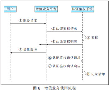 用戶在使用增值業(yè)務時,增值業(yè)務系統(tǒng)通過接口向認證鑒權(quán)系統(tǒng)發(fā)起實時用戶鑒權(quán)請求,認證鑒權(quán)系統(tǒng)按照用戶付費類型對用戶進行鑒權(quán),并對預付費用戶進行實時計費處理,成功后向增值系統(tǒng)反饋信息;對后付費用戶,產(chǎn)生原始使用記錄。