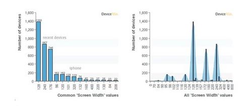 正如圖表所示,大多數的屏幕寬度主要集中在128,240和176像素這幾種類型中——而剩余的集中類型:120,130,160,208和220像素—— 和最多的三種類型值也相差不大。還有一小部分的屏幕尺寸寬度為96,101,320或是大于320像素。屏幕寬度低于128像素的設備只占了很小的比例,總共有469個設備。