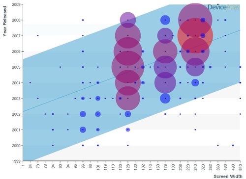 還有一點,不到5%的設備寬度大于320個像素。但這一數字可能會在未來有所提升,目前已經可以看到,小屏幕(128,176等)設備正逐漸被大屏幕(240+)設備所代替。下面的圖表給出了相關的分析。