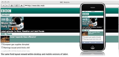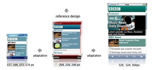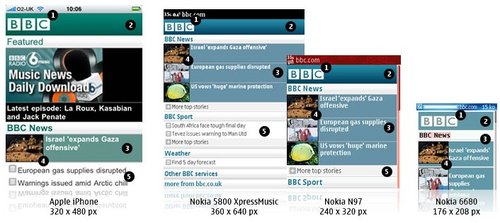 BBC還可以為特定的設備(或是一組設備)重新編排一些內容。iPhone有非常豐富的功能,因此iPhone版的BBC還有音樂下載選項,而其他的設備可能只會顯示今天最熱門的‘BBC新聞’?梢愿鶕䲠祿拇笮,多媒體的處理能力甚至是屏幕的尺寸決定是否需要針對iPhone提供更加豐富的內容。以Nokia 6680上的‘特色’顯示為例,它大部分的顯示內容是讓用戶滾動屏幕查看今天最熱門新聞故事。iPhone上顯示了三個新聞故事,而其中只有一篇配有插入。這使得用戶無需滾動屏幕就可以大致了解全部的咨詢。