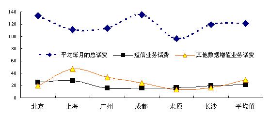 調(diào)查數(shù)據(jù)顯示,在所訪6個城市的手機(jī)用戶中,過去三個月平均每個月的話費(fèi)總額平均為121.3元(以北京和成都的用戶平均總話費(fèi)較高),其中短信話費(fèi)平均每月為14.0元,而其它數(shù)據(jù)增值業(yè)務(wù)話費(fèi)平均話費(fèi)為4.8元。