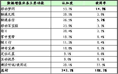 數(shù)據(jù)增值業(yè)務(wù)品牌認(rèn)知度較高的是移動夢網(wǎng)、聯(lián)通無限等,而使用率很低
