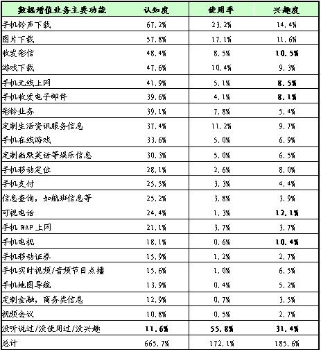 認(rèn)知度:手機(jī)鈴聲下載、圖片下載、收發(fā)彩信、游戲下載、手機(jī)無線上網(wǎng)、手機(jī)收發(fā)電子郵件、彩鈴業(yè)務(wù)、定制生活資訊服務(wù)信息(新聞、天氣預(yù)報等)等