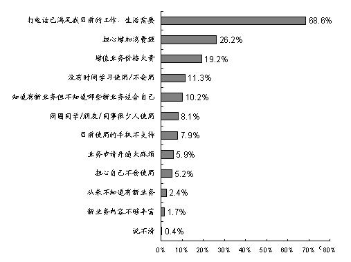 調(diào)查發(fā)現(xiàn),目前制約手機(jī)用戶使用更多數(shù)據(jù)增值業(yè)務(wù)的原因主要是:“打電話已經(jīng)滿足目前的工作/生活需要”(占68.6%)、“擔(dān)心增加消費(fèi)額”(占26.2%)、“增值業(yè)務(wù)價格太貴” (占19.2%)、“沒有時間學(xué)習(xí)使用/不會用”(占11.3%)、“知道有新業(yè)務(wù)但不知道哪些新業(yè)務(wù)適合自己”(占10.2%)等。