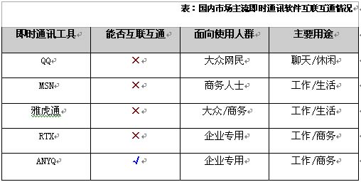 根據(jù)夏先生的提醒,筆者找到這了這個(gè)ANYQ的有關(guān)信息,據(jù)了解,該產(chǎn)品是面向企業(yè)用戶的一款商務(wù)協(xié)作軟件,其目的就是商務(wù)協(xié)作、統(tǒng)一通訊。因?yàn)樵摦a(chǎn)品采用開放的國(guó)際標(biāo)準(zhǔn)協(xié)議——XMPP協(xié)議,使其具有聯(lián)系多個(gè)即時(shí)通訊信息孤島的能力。通過各個(gè)嵌入式的網(wǎng)關(guān),企業(yè)可以通過ANYQ與OICQ、ICQ、AIM、MSN、YAHOO上的客戶、合作伙伴進(jìn)行聯(lián)系、實(shí)時(shí)交流、公文共享等企業(yè)來往。