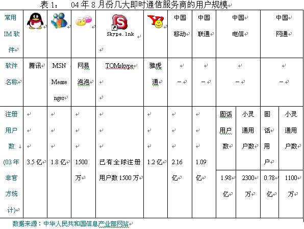 11月16日,TOM在線和歐洲行業(yè)巨頭Skype在京聯(lián)手推出聊天工具TOM-Skype,此業(yè)務(wù)的出現(xiàn),立即在即時通信市場上掀起了軒然大波。其清晰的話音質(zhì)量,簡潔方便的操作界面,擁有來自165個國家1500多萬的全球用戶,在極短的時間內(nèi)就吸引到了大量的中國用戶,更讓基礎(chǔ)運(yùn)營商感到不安的是skype強(qiáng)大的語音聊天功能將可能大大改變傳統(tǒng)電信的使用習(xí)慣;而與此同時,現(xiàn)有的QQ,POPO等國內(nèi)即時通信工具也早已開展了語音聊天功能,只是苦于目前話音質(zhì)量不盡理想而已。面對眾多虛擬運(yùn)營商現(xiàn)實和潛在威脅,幾大基礎(chǔ)運(yùn)營商選擇先下手為強(qiáng),進(jìn)入“即時通信”市場的戰(zhàn)略也就不足為怪了。