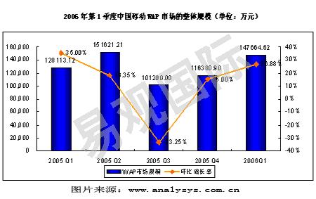 新華美通消息:易觀國(guó)際研究表明,2006年第一季度,WAP 業(yè)務(wù)整體上繼續(xù)呈現(xiàn)增長(zhǎng)態(tài)勢(shì)。但是兩大運(yùn)營(yíng)商的 WAP 業(yè)務(wù)卻呈現(xiàn)出不同的發(fā)展態(tài)勢(shì)。