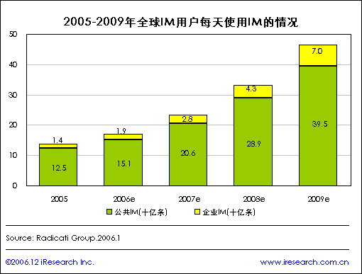 iResearch艾瑞市場咨詢根據(jù)Radicati Group統(tǒng)計顯示,到2005年底,全球總共有超過8.67億人在使用即時短信息軟件,到2009年,這個數(shù)字會增至12億。而整個IM市場(包括公眾IM和企業(yè)所用的EIM以及IM管理軟件)到2005年底將達到1.42億美元,到2009年更會增長到3.65億美元。據(jù)Radicati統(tǒng)計,目前每天網(wǎng)絡上發(fā)送的IM信息達139億條,其中125億條在公眾網(wǎng)絡上發(fā)送,14億條在企業(yè)內部通過EIM發(fā)送。從IM軟件用戶的增長趨勢可以預測出,到2009年,網(wǎng)絡上每天發(fā)出的IM信息數(shù)量將達到465億條,其中395億條在公眾網(wǎng)絡上傳輸,其余70億條在企業(yè)內部傳輸。