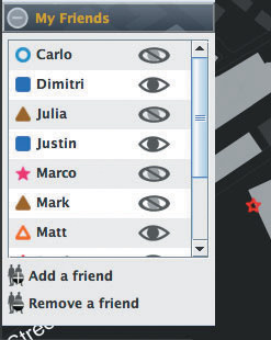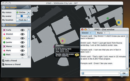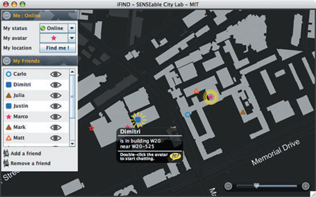 該軟件名為iFind,乍一看類似任何典型的即時(shí)通信軟件,也需要雙方相互邀請(qǐng),這樣才能進(jìn)入對(duì)方的好友名單。用戶可以選擇暫時(shí)隱藏起來(lái),不讓某個(gè)好友或者整個(gè)群組看見(jiàn)自己,他們還可以完全把某人從好友名單中刪除。不過(guò)iFind的好友名單增加了地圖,可以實(shí)時(shí)顯示這些朋友在MIT校園的哪個(gè)角落。地圖顯示了通過(guò)Wi-Fi登錄到MIT網(wǎng)絡(luò)上的好友,讓用戶可以為每個(gè)朋友創(chuàng)建獨(dú)特的迷你頭像,能看到誰(shuí)在學(xué)校河邊閑逛、誰(shuí)在樓上圖書館看書。