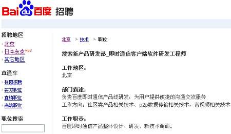 百度有意推IM產(chǎn)品的傳聞?dòng)蓙?lái)已久,不過(guò)該傳聞一直未得到官方證實(shí)。但在其官網(wǎng)最新公布的招聘頁(yè)面中,百度已向外界羅列出即時(shí)通信客戶端軟件研發(fā)工程師(搜索新產(chǎn)品研發(fā)部)、即時(shí)通信軟件產(chǎn)品經(jīng)理(客戶端軟件業(yè)務(wù)部)等職位,上述工作地點(diǎn)均在北京,可見(jiàn)百度的IM戰(zhàn)略布局已具雛形。