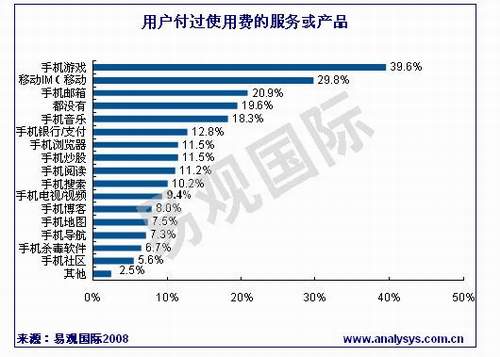 據(jù)易觀國(guó)際《中國(guó)手機(jī)應(yīng)用市場(chǎng)用戶調(diào)研報(bào)告2008》研究發(fā)現(xiàn),用戶付過(guò)使用費(fèi)的手機(jī)應(yīng)用服務(wù)及產(chǎn)品中,手機(jī)游戲、移動(dòng)IM和手機(jī)郵箱的比例較高。其中39.6%的手機(jī)應(yīng)用用戶付費(fèi)玩過(guò)手機(jī)游戲,29.8%的用戶曾經(jīng)為移動(dòng)IM付費(fèi),而手機(jī)郵箱的付費(fèi)用戶將達(dá)20%。其他手機(jī)應(yīng)用產(chǎn)品或服務(wù)中,付費(fèi)用戶的比例相當(dāng),均在10%左右,但是有近20%的用戶沒有用過(guò)任何的付費(fèi)服務(wù)或產(chǎn)品。
