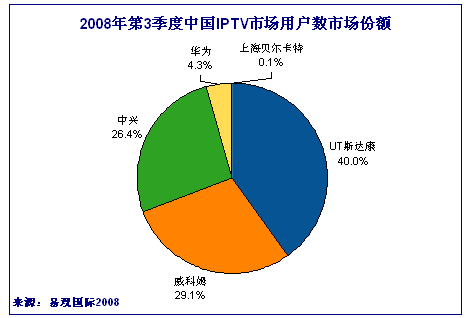 根據(jù)易觀國際(Analysys International)的研究顯示,2008年第3季度廠商的競爭格局方面沒有顯著變化,中國IPTV市場主要廠商情況如下: