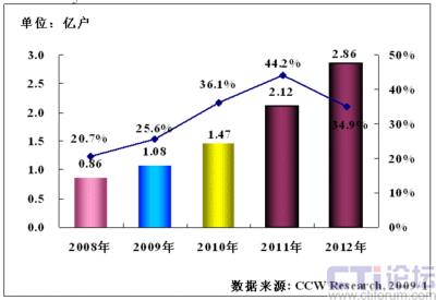 計世資訊(CCW Research)研究預(yù)測,2009年中國移動支付用戶數(shù)將達(dá)到1.08億戶,其同比增長率將達(dá)到25.6%,預(yù)計2010年中國移動支付用戶數(shù)將達(dá)到1.47億戶,其同比增長率將達(dá)到36.1%,2011年中國移動支付用戶數(shù)將達(dá)到2.12億戶,其同比增長率將達(dá)到44.2%,2012年中國移動支付用戶數(shù)將達(dá)到2.86億戶,其同比增長率將達(dá)到34.9%。