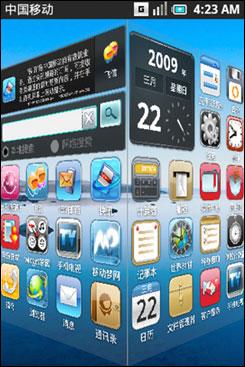 由于OMS是在基于Linux的Andriod系統(tǒng)基礎(chǔ)上,針對中國市場需求以及中國移動的自有業(yè)務(wù)所做的修改,OMS操作系統(tǒng)看上去第一直觀感受仍然是與iPhone界面和T-Mobile推出的第一款A(yù)ndriod手機“Gphone”界面非常相似。