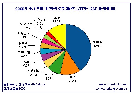 目前與新游戲平臺(tái)合作的SP包括空中網(wǎng)、騰訊、掌上明珠、TOM等在內(nèi)的共30家左右,在線游戲數(shù)量達(dá)80多款,從SP在新平臺(tái)的市場(chǎng)表現(xiàn)來(lái)看(具體見(jiàn)下圖):空中網(wǎng)占據(jù)中國(guó)移動(dòng)新平臺(tái)信息費(fèi)收入40.5%的份額,這促使空中網(wǎng)在手機(jī)游戲市場(chǎng)占據(jù)第一名的位置,目前空中網(wǎng)在新游戲平臺(tái)投放的手機(jī)游戲主要有周星星功夫臺(tái)球、異三國(guó)Online、天劫Online、功夫(周星馳大片)等,其中手機(jī)網(wǎng)游“天劫Online”的用戶歡迎度尤其突出。手機(jī)網(wǎng)游產(chǎn)品中深藍(lán)創(chuàng)娛的“深藍(lán)棋牌樂(lè)園之斗地主”、掌上明珠的“幻想i時(shí)代”、廣州盈正的“文明OL”等均有不錯(cuò)表現(xiàn)。因此用戶對(duì)手機(jī)網(wǎng)游產(chǎn)品的高關(guān)注度也肯定了了新游戲平臺(tái)推出的必要性。