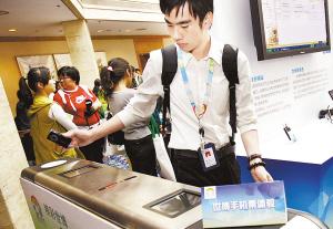 昨日,一位工作人員正在演示如何用手機(jī)檢票通過(guò)閘機(jī)。