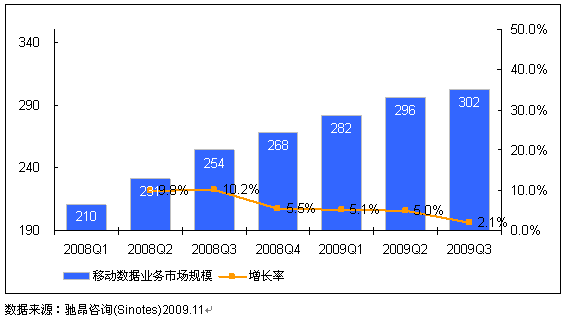 馳昂咨詢(Sinotes)發(fā)布的《2009年中國移動數(shù)據(jù)業(yè)務市場監(jiān)測-第三季度》報告數(shù)據(jù)顯示,2009年Q3中國移動數(shù)據(jù)業(yè)務市場規(guī)模達302億元,相比2009年Q2增長2.1%,表現(xiàn)出了平穩(wěn)增長的態(tài)勢。