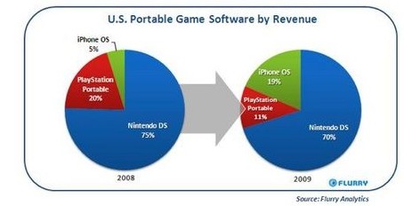 談到便攜游戲機(jī)市場(chǎng),數(shù)據(jù)更加驚人。蘋果公司的iPhone 和iPod Touch 在制定對(duì)抗索尼公司的PSP和任天堂DS的決策。iPhone OS上能運(yùn)行的游戲收入在2008年只占到便攜游戲收入的5%,而2009年增長(zhǎng)到了19%。iPhone OS操作系統(tǒng)分別從PSP和任天堂DS奪走了9個(gè)點(diǎn)和5個(gè)點(diǎn)的軟件收入市場(chǎng)份額,并且正在逐漸占領(lǐng)整個(gè)便攜式游戲市場(chǎng)。