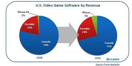 相對(duì)于全美游戲機(jī)及便攜游戲市場(chǎng)來(lái)說(shuō),iPhone/iPod Touch占游戲銷售總額的5%。(此數(shù)字包含了如PlayStation和Xbox之類的游戲機(jī)銷售額,但不包括網(wǎng)游和社交游戲)據(jù)Flurry公司數(shù)據(jù)顯示,2009年游戲銷售額占蘋果公司應(yīng)用程序總收入13.6億美元的37%。