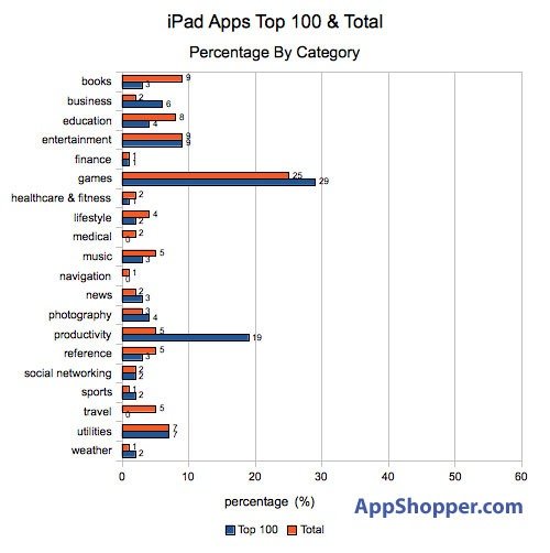 而在iPad的Top100軟件與總應(yīng)用數(shù)量在各個(gè)軟件類別的分布比例圖中: