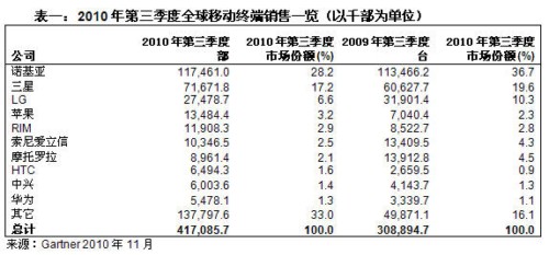 Gartner:2010年第三季度智能手機(jī)銷售增長96%