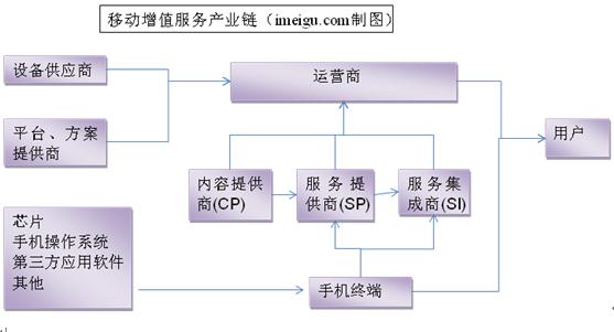中國電信,中國移動,中國聯(lián)通是中國的三大電信運營商。移動增值服務和移動支付解決方案已構成了移動運營商的兩大收入來源。移動增值業(yè)務是包括所有增進移動用戶體驗的非話音服務,在中國目前主要的四大移動增值業(yè)務是:短信、彩信、WAP和彩鈴業(yè)務。移動增值業(yè)務的產業(yè)鏈如下圖所示: