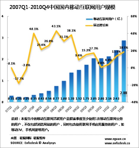 據(jù)Enfodesk易觀智庫最新發(fā)布的數(shù)據(jù)顯示,2010年第4季度中國國內(nèi)移動(dòng)互聯(lián)網(wǎng)用戶規(guī)模達(dá)2.88億人,環(huán)比增長18.52%,相比去年同期呈現(xiàn)41.48%的增長速度。