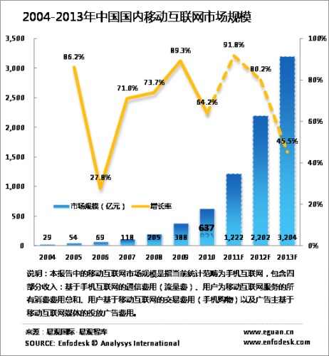 2010年中國國內(nèi)移動(dòng)互聯(lián)網(wǎng)市場規(guī)模達(dá)到637億元,較2009年上漲64.2%,增速放緩。除去流量費(fèi)之外,移動(dòng)互聯(lián)網(wǎng)服務(wù)收入達(dá)到342億元。
