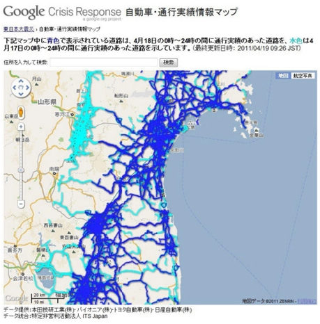 “探針”是汽車物聯(lián)網(wǎng)的重要技術(shù)之一,此前本田已經(jīng)提供了稱為“網(wǎng)上導(dǎo)航”的獨(dú)自服務(wù)。日本ITS協(xié)會(huì)希望推動(dòng)探針技術(shù)的通用化,但是廠商之間存在競(jìng)爭(zhēng)關(guān)系,難以協(xié)同一致。本次,在通行圖上,本田、先鋒、豐田、日產(chǎn)汽車都提供了信息,實(shí)現(xiàn)了共享信息,對(duì)救災(zāi)物資運(yùn)輸?shù)穆窙r信息提供了有益參考,“地震時(shí)方顯汽車物聯(lián)網(wǎng)的價(jià)值”(八木浩一)。