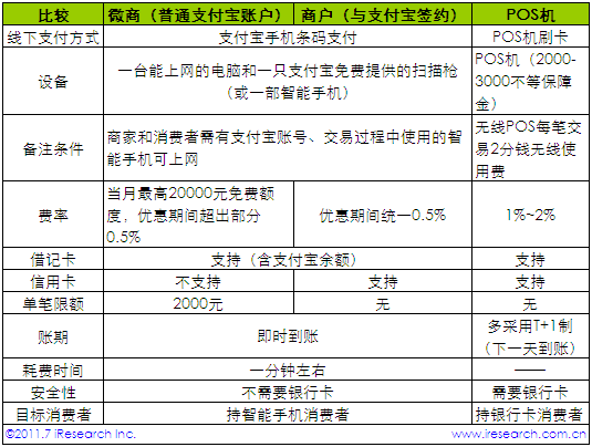 、 可用支付寶手機(jī)條碼支付的消費(fèi)者,必須同時(shí)滿足擁有智能手機(jī)、手機(jī)內(nèi)安裝有支付寶客戶端以及注冊(cè)有支付寶賬號(hào)三個(gè)條件,這也間接導(dǎo)致潛在用戶規(guī)模相比POS機(jī)偏小。
