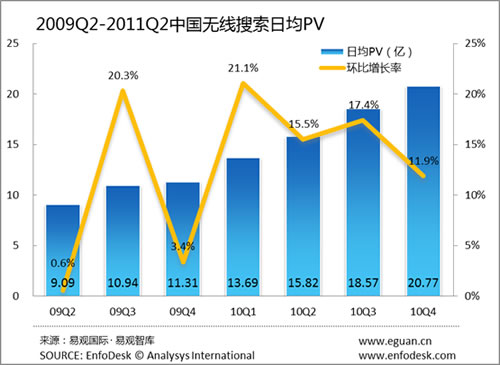 從無(wú)線搜索市場(chǎng)的PV來(lái)看,2011年第2季度中國(guó)無(wú)線搜索市場(chǎng)日均PV已經(jīng)突破24億次,環(huán)比上季度增長(zhǎng)為11.0%,增長(zhǎng)率相比上個(gè)季度開(kāi)始反彈。