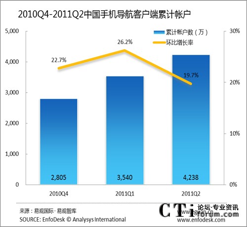 2011年Q2中國手機(jī)導(dǎo)航客戶端累計(jì)帳戶達(dá)4238萬