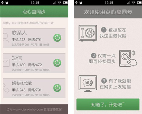 9月22日消息,繼點(diǎn)心桌面、點(diǎn)心省電等點(diǎn)心系列應(yīng)用發(fā)布之后,點(diǎn)心系列軟件迎來了新成員――點(diǎn)心盒同步,點(diǎn)心盒同步能即時將聯(lián)系人、短信、通話記錄同步備份在云端,并且支持云端管理資料和收發(fā)信息,目前支持Android2.2及其以上版本。