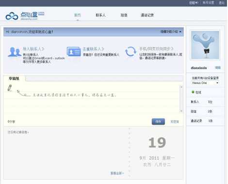 點(diǎn)心盒同步的另一特色功能就是云端收發(fā)短信和查看通話記錄。由于點(diǎn)心盒同步開啟自動同步之后是即時同步的,即使忘記帶手機(jī)也沒有關(guān)系,可以通過登陸點(diǎn)心盒網(wǎng)站來查看短信和通話記錄,這樣就可以看到?jīng)]帶手機(jī)期間誰聯(lián)系過自己,可通過云端進(jìn)行短信收發(fā),而且可利用云端來快速大量發(fā)送短信。用戶只需一臺可以上網(wǎng)的電腦或Pad,登錄點(diǎn)心盒,就可以隨時隨地打開網(wǎng)頁瀏覽手機(jī)里的資料。